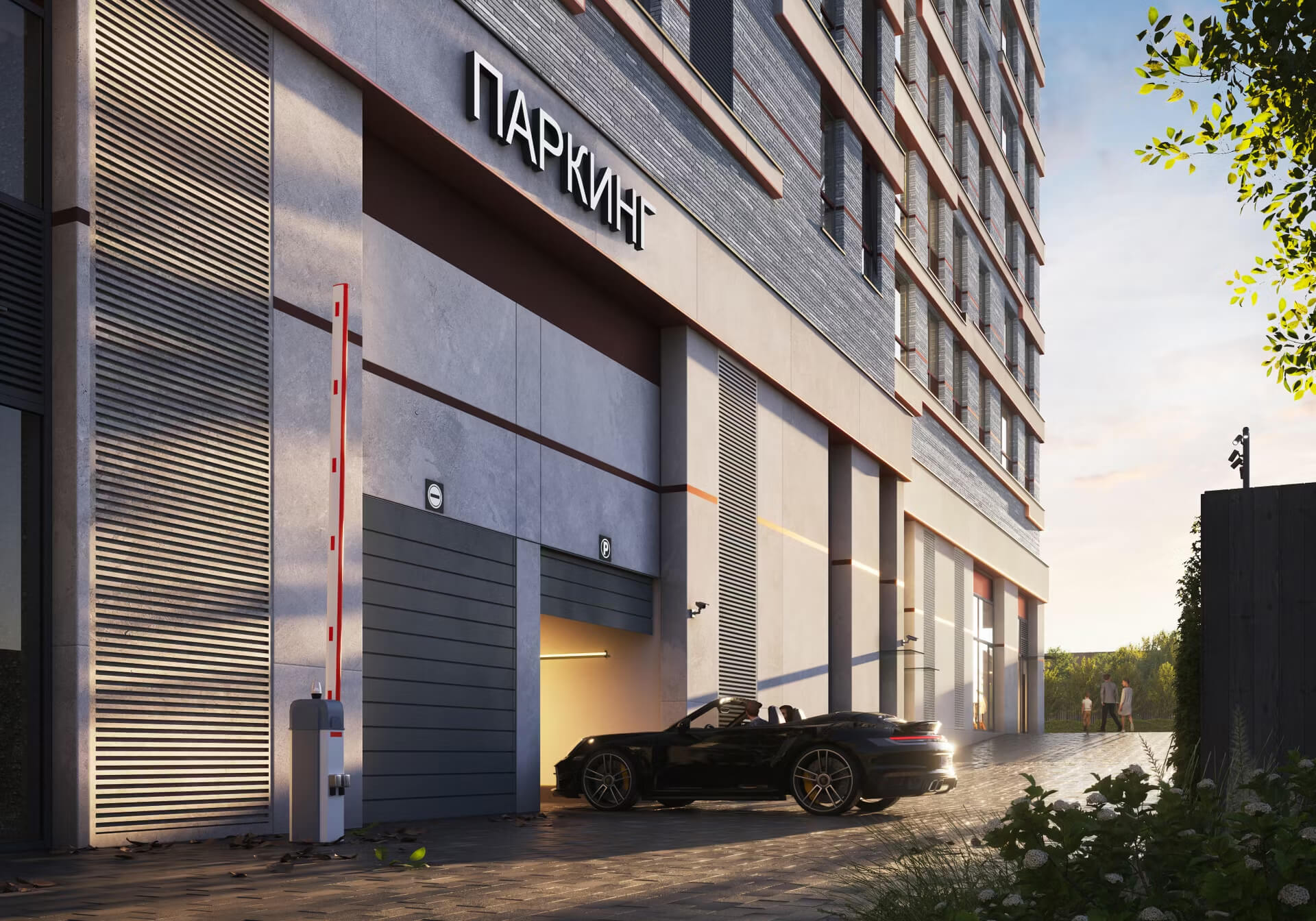 Широкие парковочные места позволяют удобно размещать автомобили любого класса. Также предусмотрены зоны для зарядки электромобилей и велопарковки.