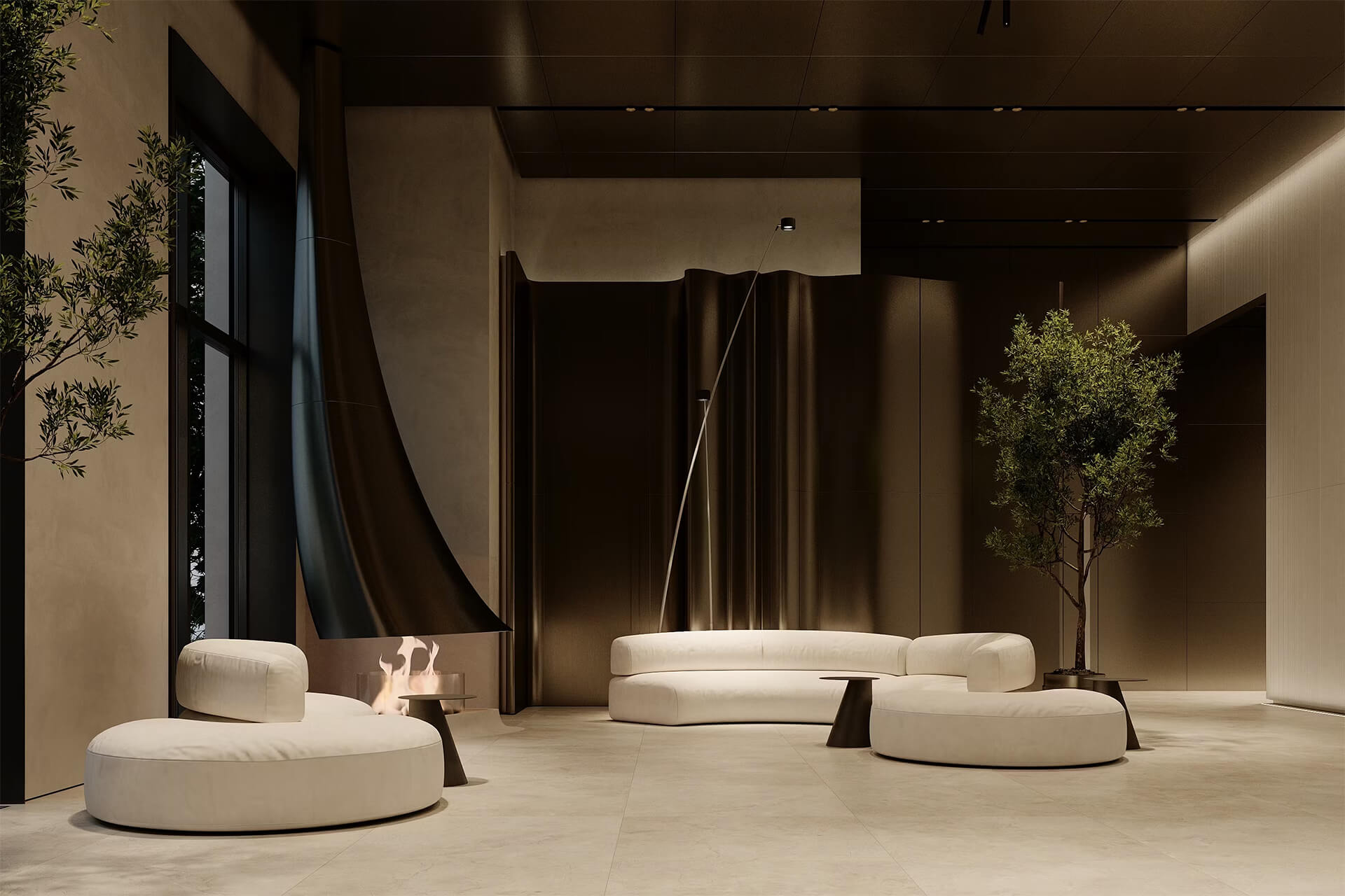 Гранд-лобби The Lake — это элегантное пространство, задающее тон всему комплексу. Высокие пятиметровые потолки, панорамные окна, каминная зона и дизайнерская мебель создают атмосферу уюта и респектабельности.